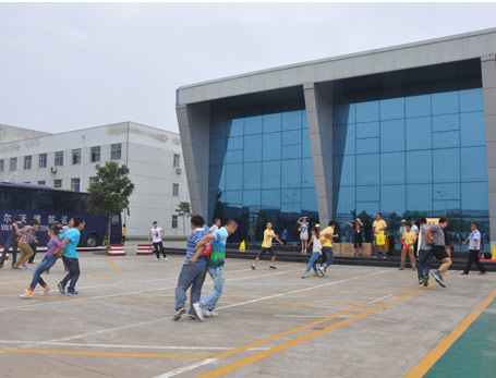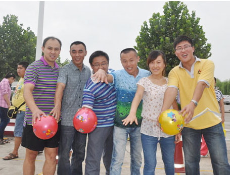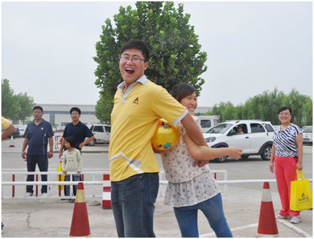 一声哨响,背靠背的七队搭档开始侧身飞奔,一边要注意脚下的步子谐调并进,一边要留意后背间的皮球有没有“溜”出来,还要时不时地关注下竞争对手的情况,每组选手都“忙”得不亦乐乎!由于默契度明显不在一个层面上,各组的差距也很快显现出来,两队夫妻档表现各异,一组一马当先另一组则不幸被落到了最后,形成了有趣的对比……