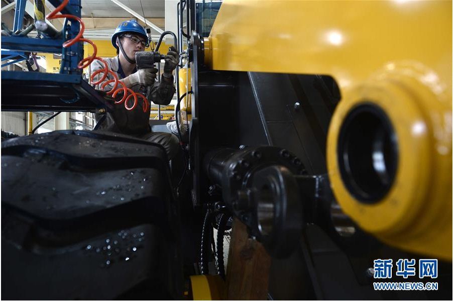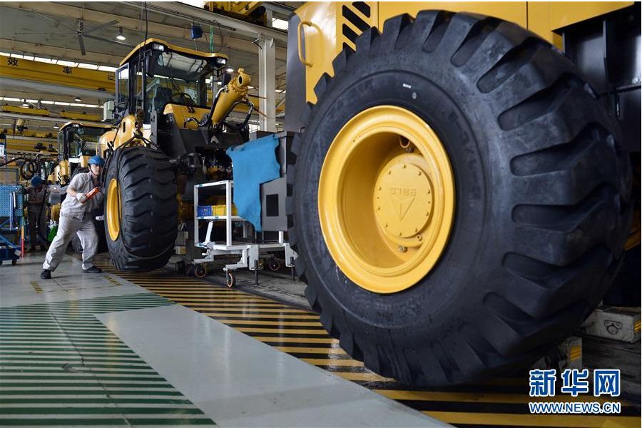 在山东凯发k8娱乐工程机械有限公司,工人在装载机生产线作业